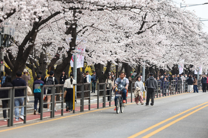 | ▲1일 오후 서울 여의도 윤중로 벚꽃길에서 시민들이 활짝 핀 벚꽃을 즐기고 있다. 윤중로 벚꽃길은 이날부터 여의도 봄꽃축제를 위해 8일까지 교통이 전면통제된다. /사진-뉴스1 |