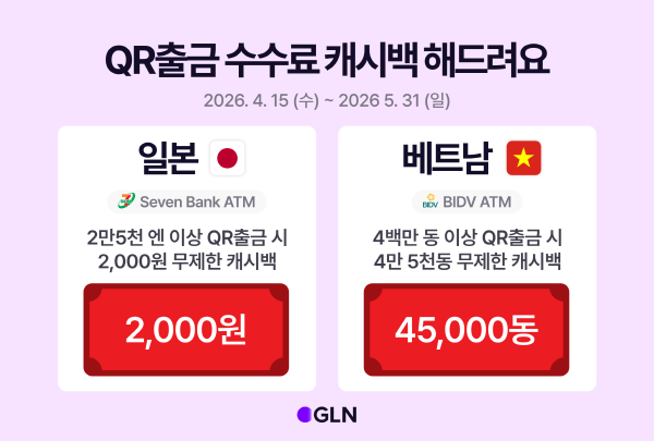이석 GLN 대표는 “이번 일본·베트남·라오스 QR출금 서비스 확대를 통해 더 많은 손님들이 익숙한 국내 앱으로 해외 현지에서도 불편함 없이 현금 인출 서비스를 누릴 수 있게 됐다”며 “앞으로도 해외여행 손님들에게 별도의 환전이나 실물카드 소지가 필요 없는 간편 출금 경험을 선도해 나가겠다”고 밝혔다.