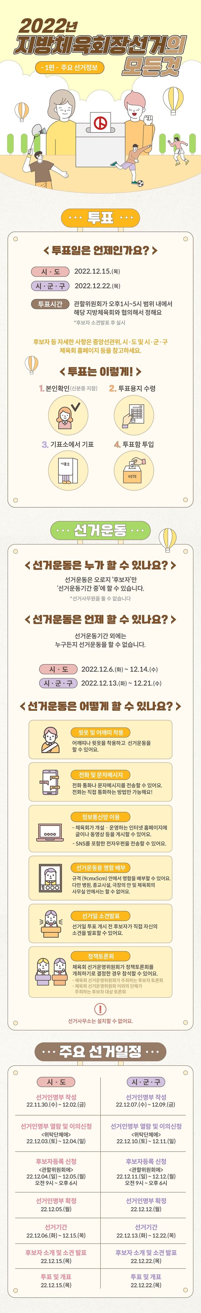 전국 17개 시·도 및 228개 시·군·구에서 치러지는 이번 선거는 2020년 「국민체육진흥법」 개정으로 시·도 및 시·군·구 체육회장선거가 의무위탁 대상으로 변경된 후 선관위에서 처음 관리하는 선거다.