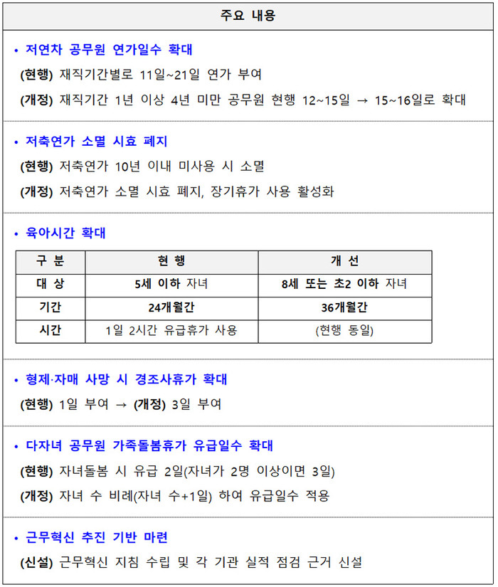 또한 재직 기간이 1년 이상 4년 미만인 저연차 공무원의 연가일수가 현행 12~15일에서 15~16일로 확대된다.