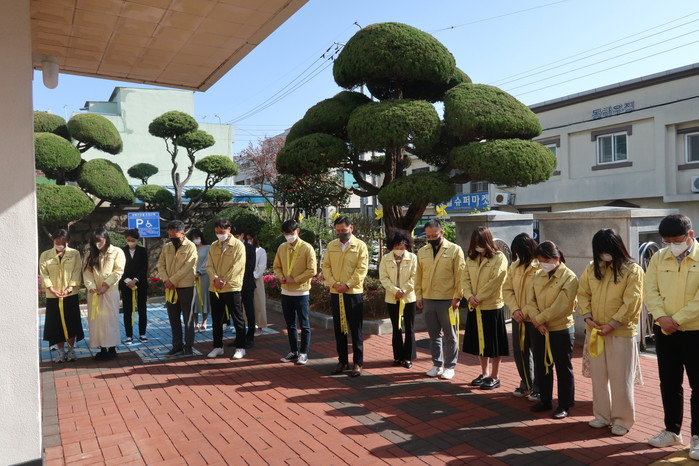 세월호 헌정곡인 ‘천개의 바람이 되어’곡이 연주되는 동안 전 직원은 추모 묵념 시간을 가졌다. 이어서 ‘별이 된 학생들과 선생님을 영원히 잊지 않겠습니다’, ‘안전한 학교, 새로운 교육, 행복한 미래’등 추모 문구를 적은 리본을 각자 청사 주변에 매다는 행사를 진행 하였다.