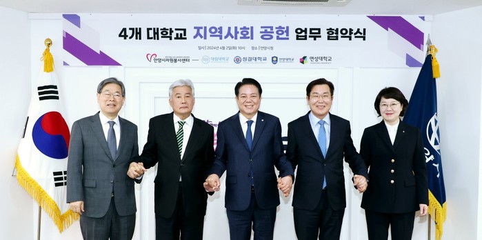 [프레스뉴스] 장현준 기자= 안양시 자원봉사센터(이사장 최대호)는 2일 관내 4개 대학교(대림대ㆍ성결대ㆍ안양대ㆍ연성대)와 지역사회 공헌을 위한 업무협약을 체결했다고 밝혔다.