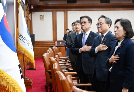 | ▲최상목 대통령 권한대행 부총리 겸 기획재정부 장관을 비롯한 국무위원들이 7일 정부서울청사에서 열린 국무회의에서 국기에 대한 경례를 하고 있다.(사진= 기획재정부) |