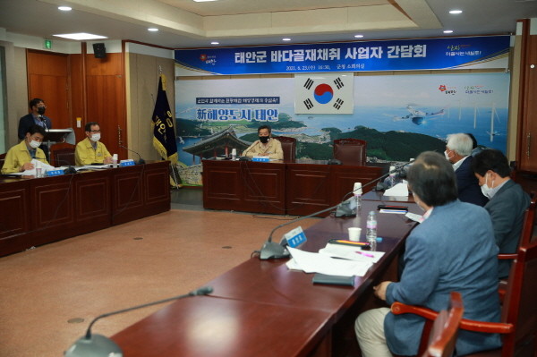 ▲ 지난 6월 23일 군청 소회의실에서 열린 바다골재채취 사업자 간담회(사진제공=태안군) |
