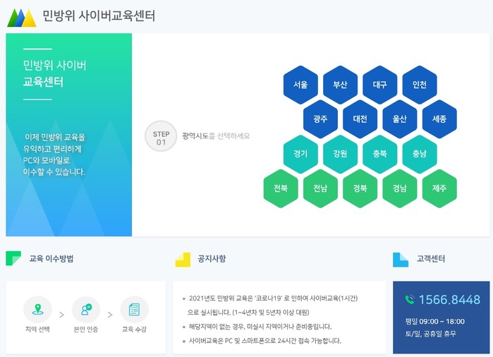 민방위 보충교육은 전국 어디에서나 PC와 스마트폰을 이용해 받을 수 있으며, 민방위사이버교육에 접속해 본인인증 후 수강하고, 진도율 100%, 객관식 평가 20문항 중 70점 이상을 맞으면 이수한 것으로 인정된다.
