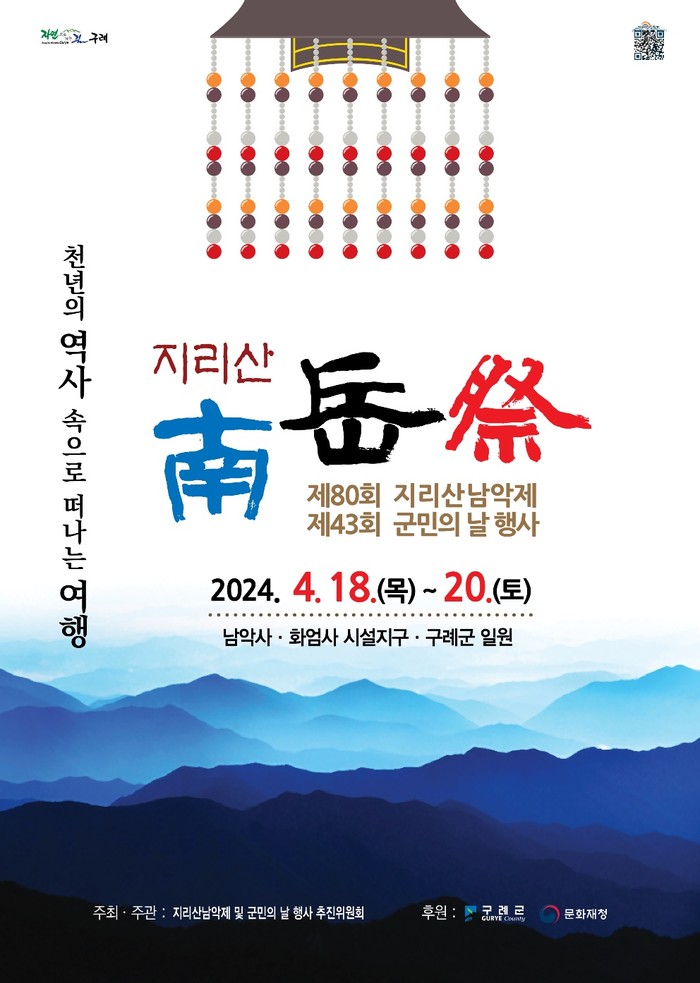 [전남=프레스뉴스] 강래성 기자= 전남 구례군은 4월 18일부터 20일까지 ‘천년의 역사 속으로 떠나는 여행’이라는 주제로 남악사, 화엄사 시설지구, 공설운동장 일원에서 「제80회 지리산남악제 및 제43회 군민의 날 행사」를 개최한다고 밝혔다.