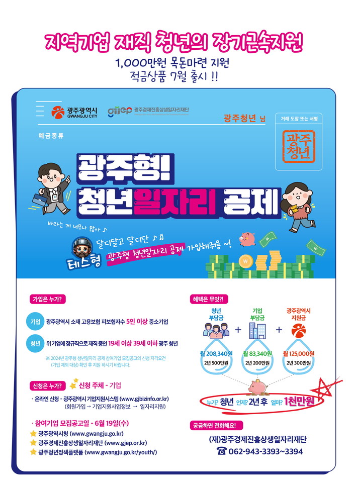 이 사업은 지역 중소기업 재직 청년에게 재정 지원을 통해 장기 근속과 지역 정착을 유도하고, 미취업 청년의 지역 중소기업 유입 촉진을 위해 도입됐다. 중소기업 재직 청년이 2년 간 500만원을 모으면 기업(200만원)과 광주시(300만원)가 500만원을 추가 적립해 만기공제금 1000만원을 만들어주는 사업이다.