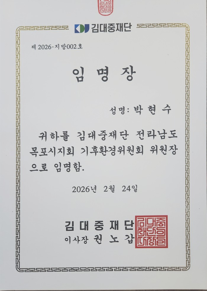 | ▲김대중재단 전라남도 목포시지회 기후환경위원회 위원장으로 임명/본인 제공 |