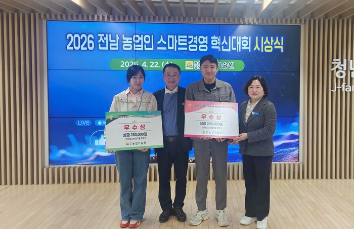 [전남=프레스뉴스] 강래성 기자= 영광군(영광군수 권한대행 부군수 송광민)은 지난 4월 22일 전라남도농업기술원 창농타운에서 열린 ‘2026년 전남 농업인 스마트경영 혁신대회’에서 관내 청년농업인 2명이 우수상을 수상했다고 밝혔다.