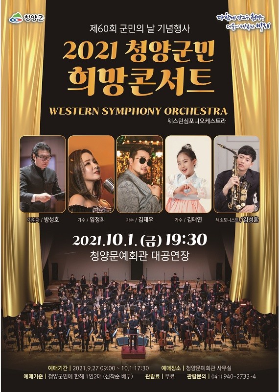 행사는 오전 10시 군민의 날 기념식과 오후 7시30분 콘서트로 진행될 예정이다. 1부 기념식에는 청양군립합창단과 청양국악협회가 출연해 자리를 빛내고, 2부 콘서트에는 국내 최정상의 웨스턴심포니오케스트라와 가수 김태우, 가수 임정희, 미스트롯 김태연, 섹소폰 연주자 김성훈 등이 출연한다.