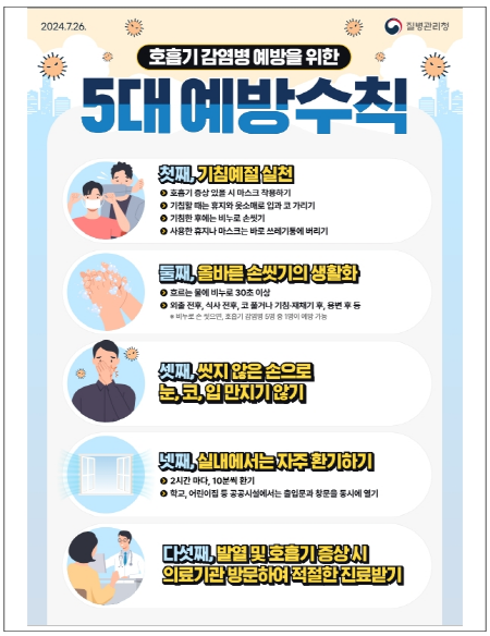 이에 시는 가파른 확산세를 막고자 5대 예방수칙을 적극 홍보하고 있다. ▲기침예절 실천 ▲올바른 손씻기 생활화 ▲씻지 않는 손으로 눈, 코, 입 만지지 않기 ▲실내 자주 환기하기 ▲발열 및 호흡기 증상 시 의료기관 방문 및 진료받기 등을 안양시 보건소 홈페이지(감염병 소식지)에 게시 및 보건소 이용 시민들에게 안내하고 실천을 강조하고 있다.