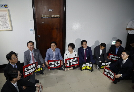 이 날 국민의힘 법사위원들은 정청래 법사위원장실 앞을 점거하며 탄핵청문회 저지를 위해 농성을 벌였다.