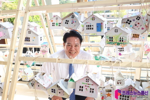 | ▲최대호 안양시장이 지난 9일 김중업건축박물관에서 열린 안양건축문화제에서 어린이들이 만든 작품과 함께 기념사진을 찍고 있다.(사진=안양시) |