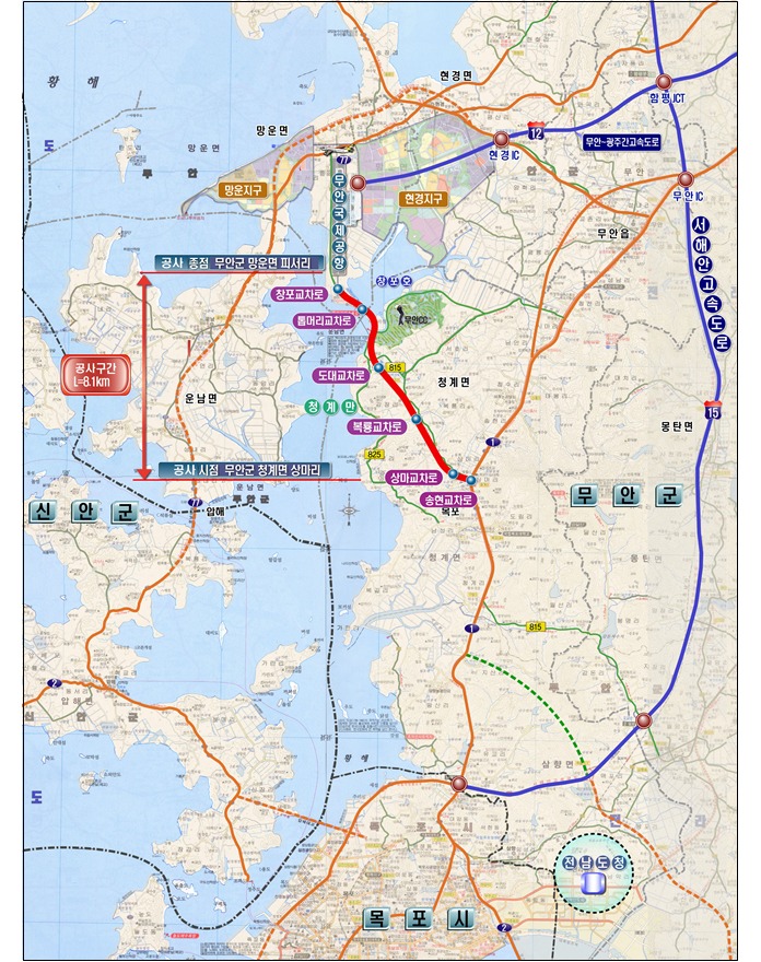 무안국제공항 진입도로 4차로 확·포장공사는 지방도 815호선으로 무안 청계면 상마리 청계삼거리에서 망운면 피서리 무안국제공항을 연결하는 총연장 8.12㎞ 구간이다. 도비 945억 원을 들여 2010년 6월 착공 후 11년 만에 개통하게 됐다.