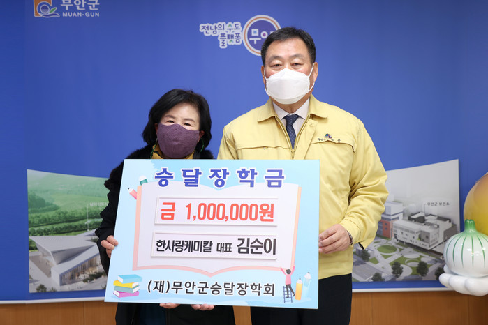 | ▲한사랑케미컬 김순이 대표 승달장학금 기탁/무안군 제공 |