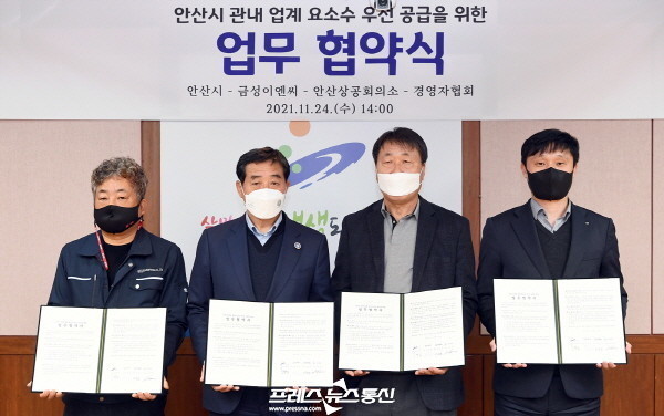 [프레스뉴스] 강보선 기자= 안산시(시장 윤화섭)는 24일 ㈜금성이엔씨·안산상공회의소·(사)스마트허브경영자협회와 업무협약을 맺고 관내 기업 소유의 화물차에 대한 요소수 우선 공급에 힘을 모으기로 했다.