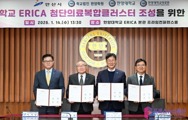 안산시(시장 이민근)는 14일 오후 한양대학교 ERICA 프라임컨퍼런스홀에서 학교법인 한양학원, 한양대학교, 한양대의료원과 공동으로 ‘한양대학교 ERICA 첨단의료복합클러스터 조성을 위한 업무협약’을 체결했다고 밝혔다.