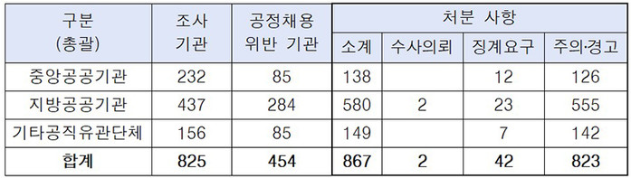 채용 과정에서 합격자나 응시자의 평정 순위에 영향을 미칠 수 있는 중대한 과실 등 42건에 대해서는 징계를 요구할 예정이며, 각 공직유관단체 감사·징계 기준에 따라 채용 과정에서 업무 부주의로 인한 ‘주의·경고’ 사항은 총 823건으로 확인됐다.
