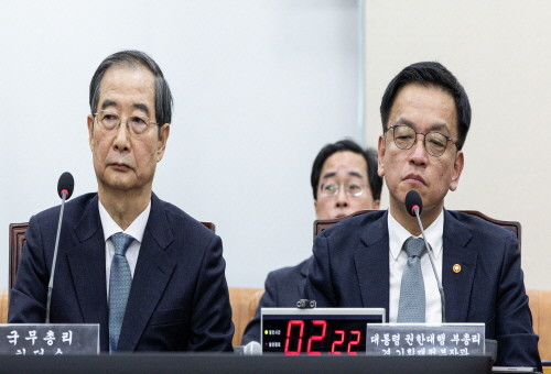 ▲최상목 대통령 권한대행 부총리 겸 기획재정부 장관(오른쪽)과 한덕수 국무총리가 지난 2월 6일 국회에서 열린 윤석열 정부의 비상계엄 선포를 통한 내란 혐의 진상규명 국정조사특별위원회 제3차 청문회에 출석해 있다.(사진= 뉴스1) |