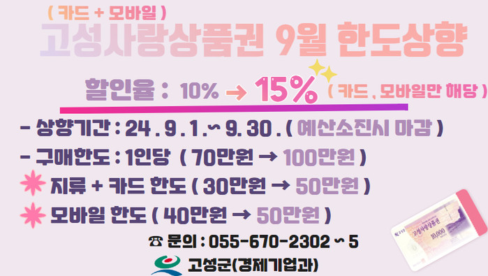 | ▲고성사랑상품권 9월 한 달간 최대 20% 혜택(한도상향 카드)사진=고성군 |