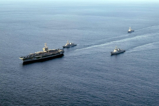 | ▲ 한미일간 해상훈련 모습. 앞줄 왼쪽부터 미 해군 항공모함 칼빈슨함, 일본 해상자위대 구축함 키리사메함, 한국 해군 이지스구축함 세종대왕함, 미 해군 이지스구축함 키드함. (사진=미 해군) |