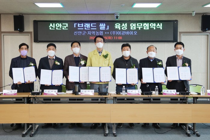 [전남=프레스뉴스] 강래성 기자= 신안군은 15일 ㈜이강바이오(대표 이승준)와 관내 7개 농협(압해농협, 임자농협, 북신안농협, 신안농협, 남신안농협, 비금농협, 도초농협) 조합장이 참석한 가운데 ‘신안군 브랜드 쌀 육성을 위한 업무협약’을 체결했다고 밝혔다.
