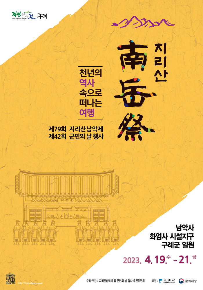 [전남=프레스뉴스] 강래성 기자= 전남 구례군은 오는 4월 19일부터 21일까지 ‘천년의 역사 속으로 떠나는 여행’이라는 주제로 남악사, 화엄사 시설지구, 공설운동장 등 구례군 일원에서 「제79회 지리산남악제 및 제42회 군민의 날 행사」를 개최한다고 밝혔다.