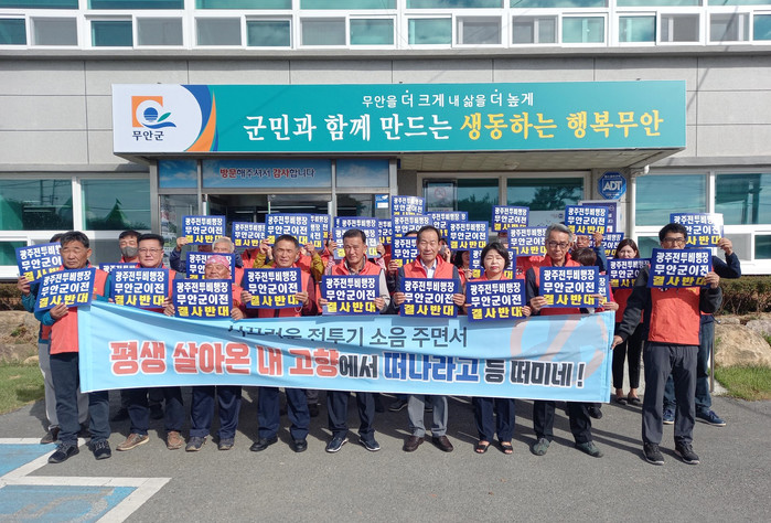 최근 무안군이 광주 군 공항 예비 이전과 관련해 유력 후보지라는 기사가 보도됨에 따라 풍요로운 고향 무안을 지키기 위해 민·관·정이 하나가 돼 군공항 이전 반대 피켓과 현수막을 들고 나섰다.
