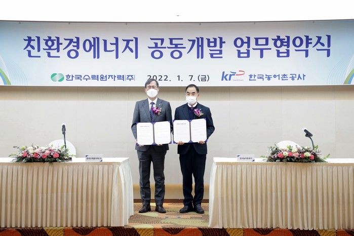 [전남=프레스뉴스] 강래성 기자= 한국농어촌공사(사장 김인식)는 한국수력원자력(사장 정재훈)과 7일 서울 프레지던트호텔에서 ‘친환경에너지 공동개발 양해각서(MOU)를 체결하고, 농업생산기반시설을 활용한 친환경에너지 자원개발 등 친환경에너지 개발과 보급에 협력하기로 했다.