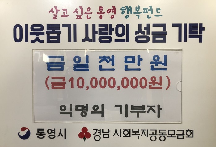 익명의 기부자가 보내온 성금은 ‘통영 행복펀드’로 적립해 저소득 고교생 교통비 지원, 희귀난치성 질환 의료비 지원, 1인 가구 간병비 지원 등 우리 지역의 어려운 이웃을 위한 다양한 복지사업을 위해 사용될 예정이다.