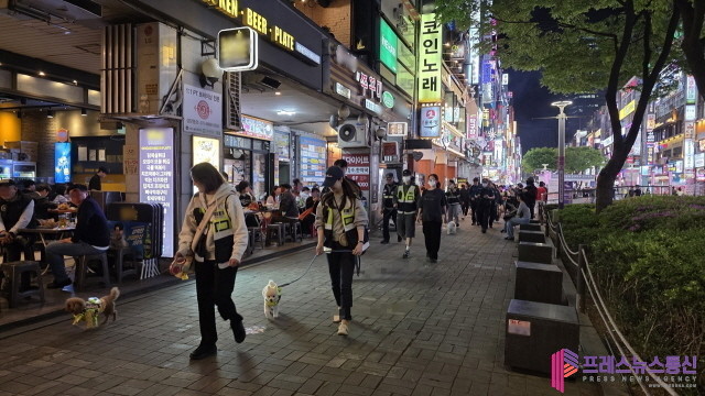 | ▲안양시 반려견 순찰대 양반견이 지난 23일 저녁 범계로데오 거리를 합동 순찰하고 있다.(사진=안양시) |