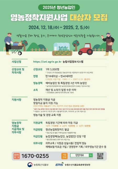 신청 자격은 만 18세 이상에서 만 40세 미만의 독립경영 3년 이하 전업농 및 영농 예정자가 해당한다. 사업 신청은 농림사업정보시스템을 통해 온라인으로 내년 2월 5일까지 신청하면 된다.