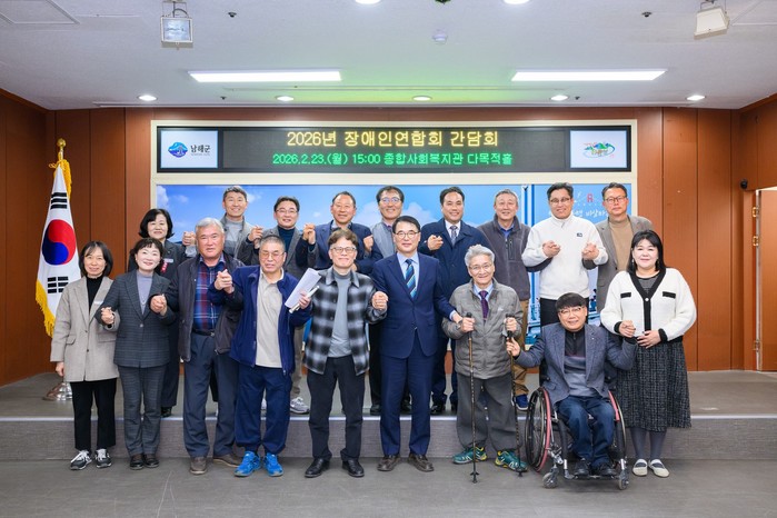 장충남 남해군수를 비롯한 12개 장애인단체·시설 대표가 참석한 가운데, 군은 2026년 신규사업으로 심한 장애인 목욕탕 편의지원과 이동식 경사로 무료대여 등을 소개했다.