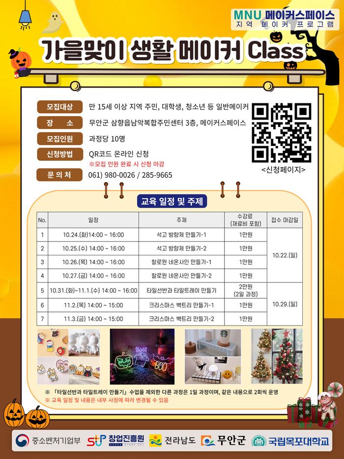 [전남=프레스뉴스] 강래성 기자= 전남 무안군(군수 김산)은 국립목포대학교 창업혁신센터(센터장 유영재)에서 운영하는 MNU메이커스페이스에서 대학생, 지역주민, 청소년을 대상으로 ‘가을맞이 생활메이커 클래스’ 교육을 운영한다고 밝혔다.