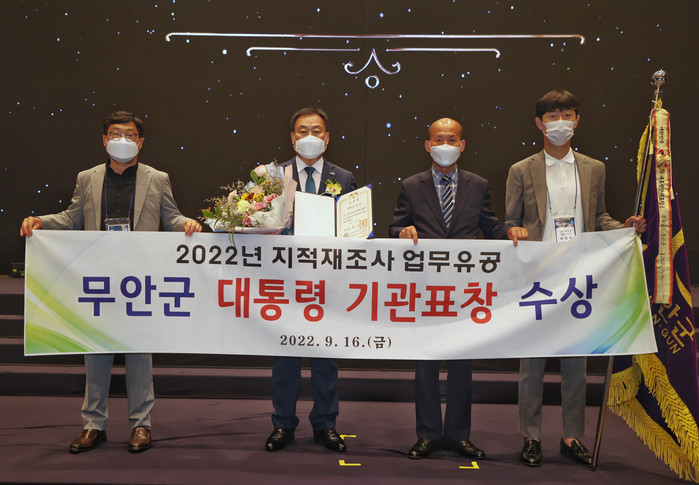 무안군(군수 김산)은 지난 16일 국토교통부에서 주관하는 제2회 디지털 지적의 날 행사에서 지적재조사사업 활성화에 기여한 공로를 인정받아 대통령 기관표창을 수상했다고 밝혔다.