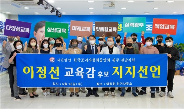 (사)조리사협회 중앙회 광주전남 안유성 지회장 등 2000여명은 이에 앞서 지난 18일 이 후보 사무실에서 지지를 공식화했다. 안 지회장은 “조리사협회는 단체급식 종사자 등 교육현장과 밀접한 관계를 맺고 있으며 학생들은 외식산업으로 진출하고 있어 교육과 관련이 깊다고 할 수 있다. 이에 훌륭하고 준비된 이정선 후보를 지지한다”고 밝혔다.