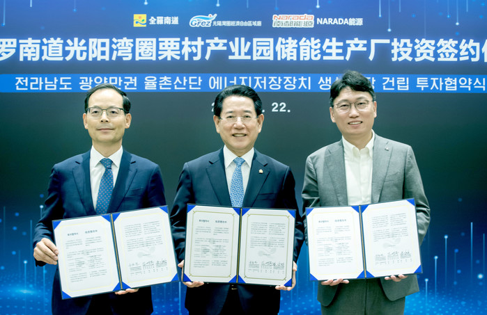 중국을 방문 중인 김영록 지사는 이날 오전 상하이 홍차오 힐튼 호텔에서 송상락 광양만권경제자유구역청장, 박송철 나라다에너지 대표 등이 참석한 가운데 광양만권 율촌산단에 에너지저장장치 생산공장을 건립키로 하는 투자협약식을 가졌다.