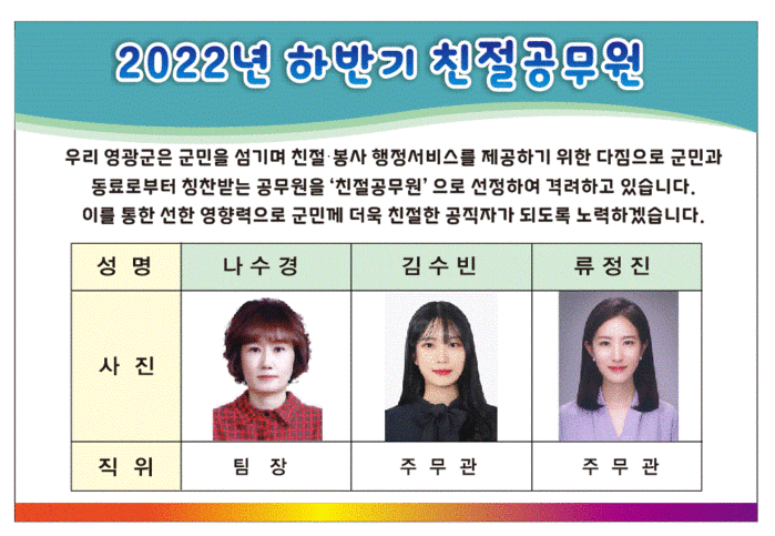 | ▲ 영광군은 '2022년 하반기 친절공무원'을 선발했다.(사진제공=영광군) |