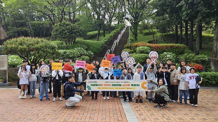 | ▲고성군이 지난 18일 남산공원 일원에서 청소년방과후아카데미 소속 청소년과 학부모 40여 명이 참여한 가운데 '자원봉사로 지키는 자원안보 캠페인'을 실시했다. (사진=고성군) |