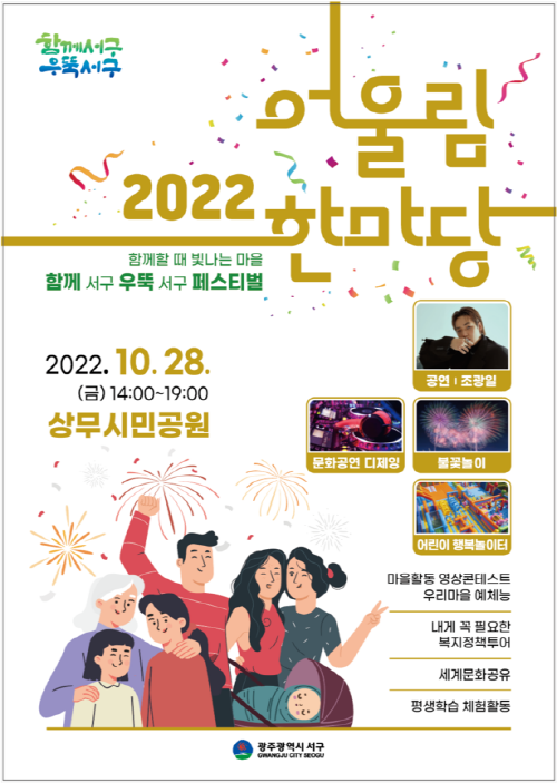 [광주=프레스뉴스] 강래성 기자= 광주 서구(구청장 김이강)가 오는 28일 상무시민공원 일원에서 아이부터 어르신까지 전 세대가 함께하는 소통과 화합의 대축제 ‘2022 어울림한마당’을 개최한다.