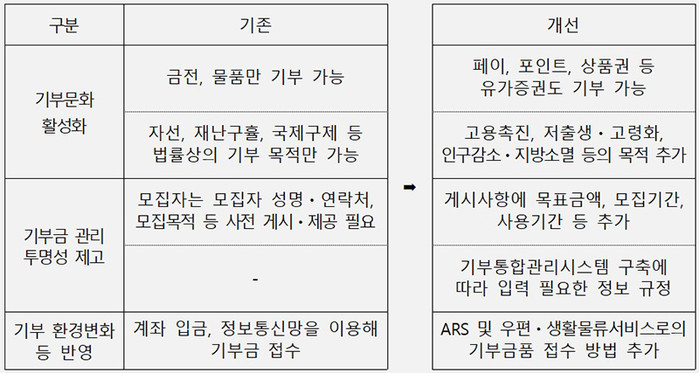 먼저, 기부문화 활성화를 위해 유가증권을 기부금품에 포함하는데, 기부 모집 단체는 카드사 등 발행처와 협의해 해당 포인트 등을 기부할 수 있는 기부처 목록에 모집단체명을 추가할 수 있다.