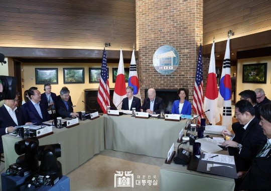 | ▲윤 대통령과 바이든 대통령, 기시다 일본 총리가 18일(현지시간) 워싱턴 DC 인근 미국 대통령 별장인 캠프 데이비드에서 한미일 정상회의를 하고 있다.(사진=대통령실) |