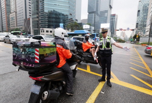 | ▲16일 서울 강남역 사거리에서 이륜차 무질서 운행 집중 단속을 하고 있다.(사진= 뉴스1) |