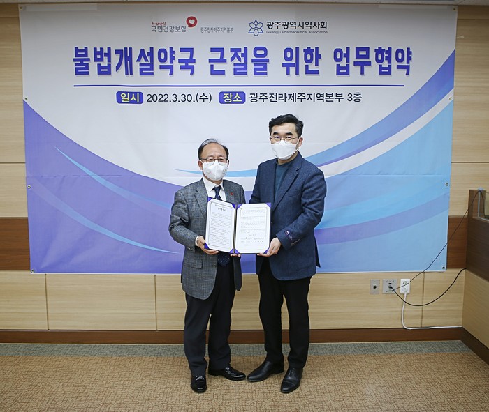 [광주=프레스뉴스] 강래성 기자= 국민건강보험공단 광주전라제주지역본부(본부장 정일만, 이하 ‘건보공단 광주본부’)는 2022.03.30.(수) 광주광역시약사회(회장 박춘배, 이하 ‘광주약사회’)와 불법개설약국 근절 및 건전한 약무질서 확립을 위한 업무협약을 체결하였다.