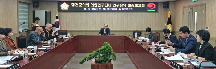 | ▲합천군의회(의장 정봉훈)는 12일 의원 연구단체 ‘합천군 재정 효율화 정책연구회’에서 추진한 연구용역 최종보고회를 가졌다. (사진=합천군의회) |