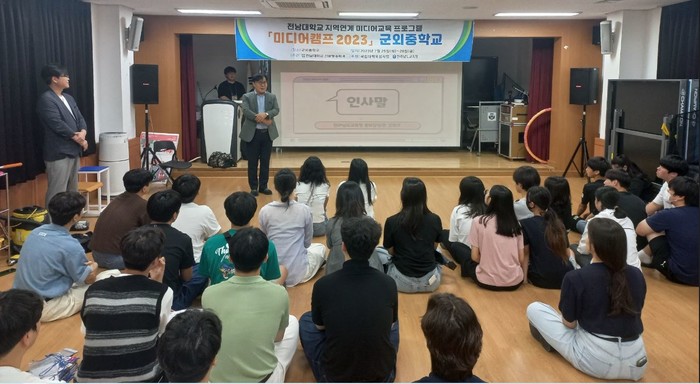 소외 지역 청소년에게 미디어 홍보 역량을 갖춘 미래인재로 성장할 기회를 제공하기 위해 마련된 이번 캠프는 전남대학교 신문방송학과 교수 및 학생이 주관하며, 군외중학교 학생과 전남대 운영진과 교직원 등 40여 명이 참여했다.
