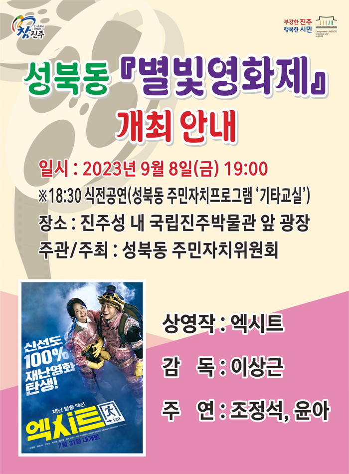 역사 깊은 호국성지 진주성 내 위치한 국립진주박물관 앞 광장에서 개최되며 코미디 재난영화‘엑시트’를 상영한다.