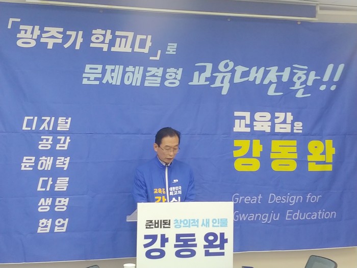 [광주=프레스뉴스] 강래성 기자= 강동완 광주시 교육감 예비후보는 오늘 오전 광주시교육청 브리핑 룸에서 기자회견을 열고 지난 70여년간의 아날로그 경제사회로부터 다가오는 디지털 경제사회로의 전환에 5.18 정신을 접목하는 사회문제해결형 교육모델을 제안하였다.