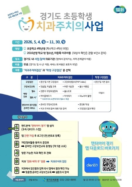 서비스 이용을 원하는 학생과 보호자는 ‘덴티아이’ 모바일 앱에서 온라인 문진표 작성과 교육 이수 후, 앱에서 확인할 수 있는 지정 의료기관에 전화로 예약해 이용하면 된다. 안산시뿐만 아니라 경기도 내 지정 치과에서도 동일한 서비스를 받을 수 있다.