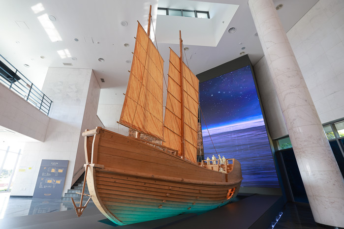 장보고기념관 1층에는 동아시아 바다를 누빈 장보고 선을 복원하여 거센 파도를 항해하는 정신을 표현했다.